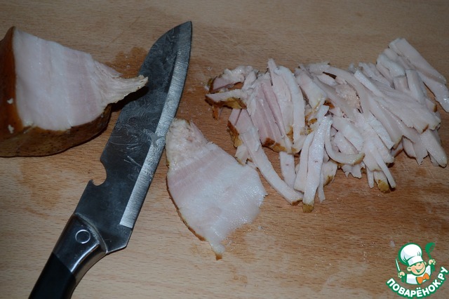 Лук почистить, мелко порубить и добавить к бекону, все перемешать и обжарить лук до прозрачности.