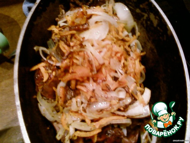 Когда мясо подрумянится, добавить к нему натертую морковку и лук полукольцами. Все вместе опять прижарить.