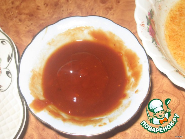 Готовим соус: смешиваем соевый соус, томатную пасту и мед (если вы возьмете кетчуп или соус томатный, меда ложите меньше в 2 раза). Хорошо размешиваем.