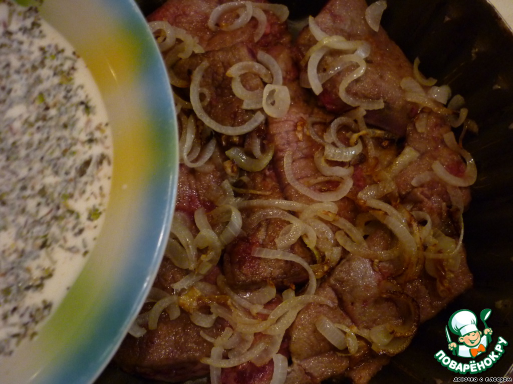 Печень очистить от пленок, нарезать порционными кусками толщиной, примерно, 0,7-1 см. Слегка отбить. Залить молоком минимум на 2 часа.