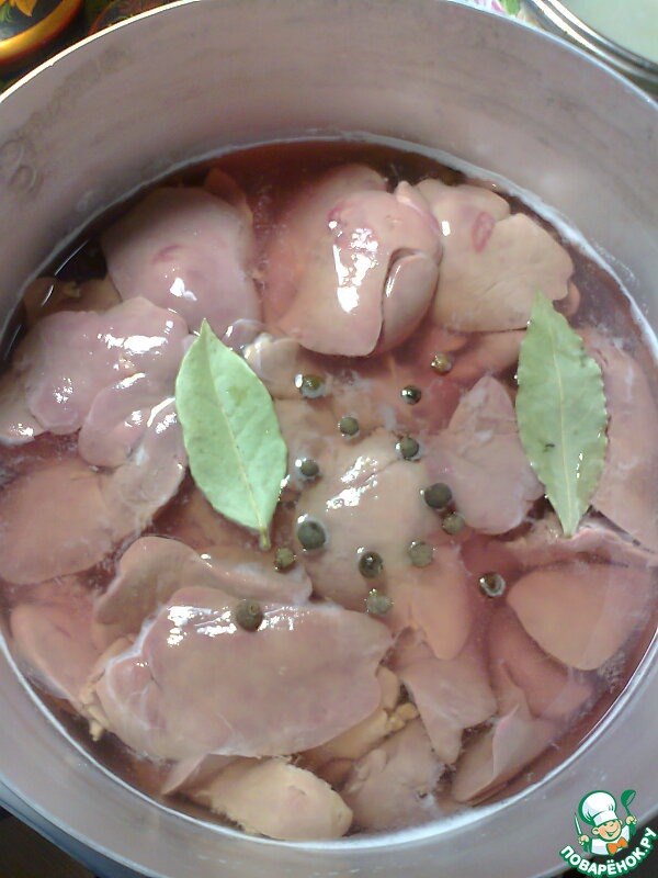 Печень промыть, удалить протоки и пленки, выложить в кастрюлю. Залить печень водой так, чтобы она лишь покрывала её, добавить вино, лавровый лист и перец душистый горошком, посолить и варить до готовности около 10 мин.
