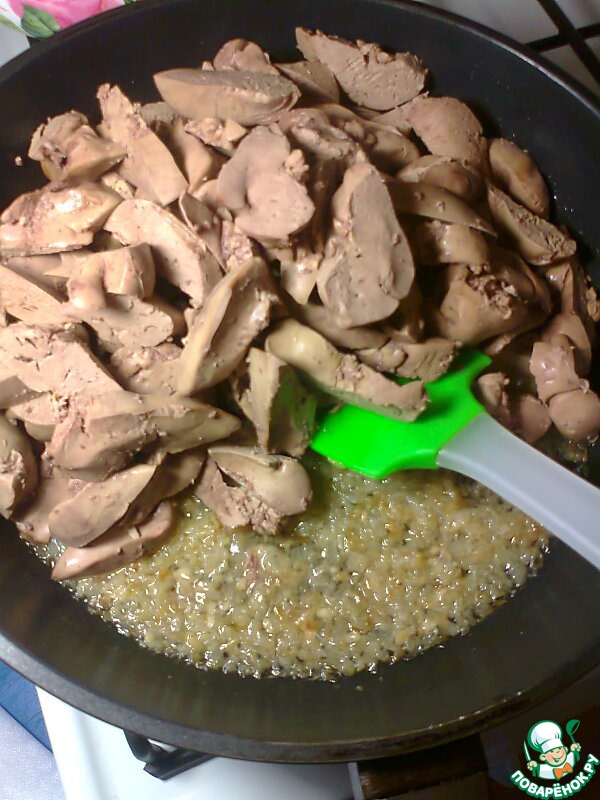 Порезаную печень добавляем к луку и чесноку с небольшим количеством нашего бульона.