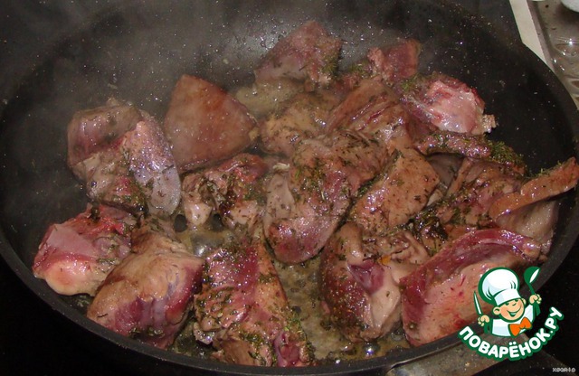 Сердце режем на куски...обжариваем пока не изменит цвет..солим...перчим...добавляем любимые специи..чеснок..сушеную зелень.и укладываем в жаровню(У меня утятница)