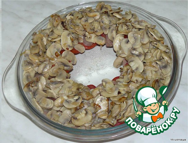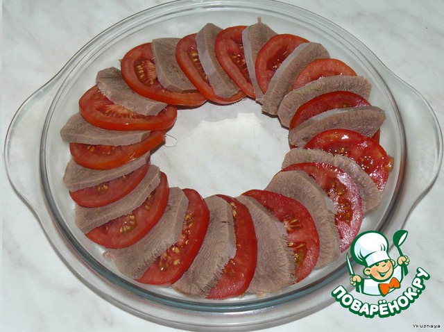 Выложить кольцом в круглую форму, чередуя язык и помидоры.
