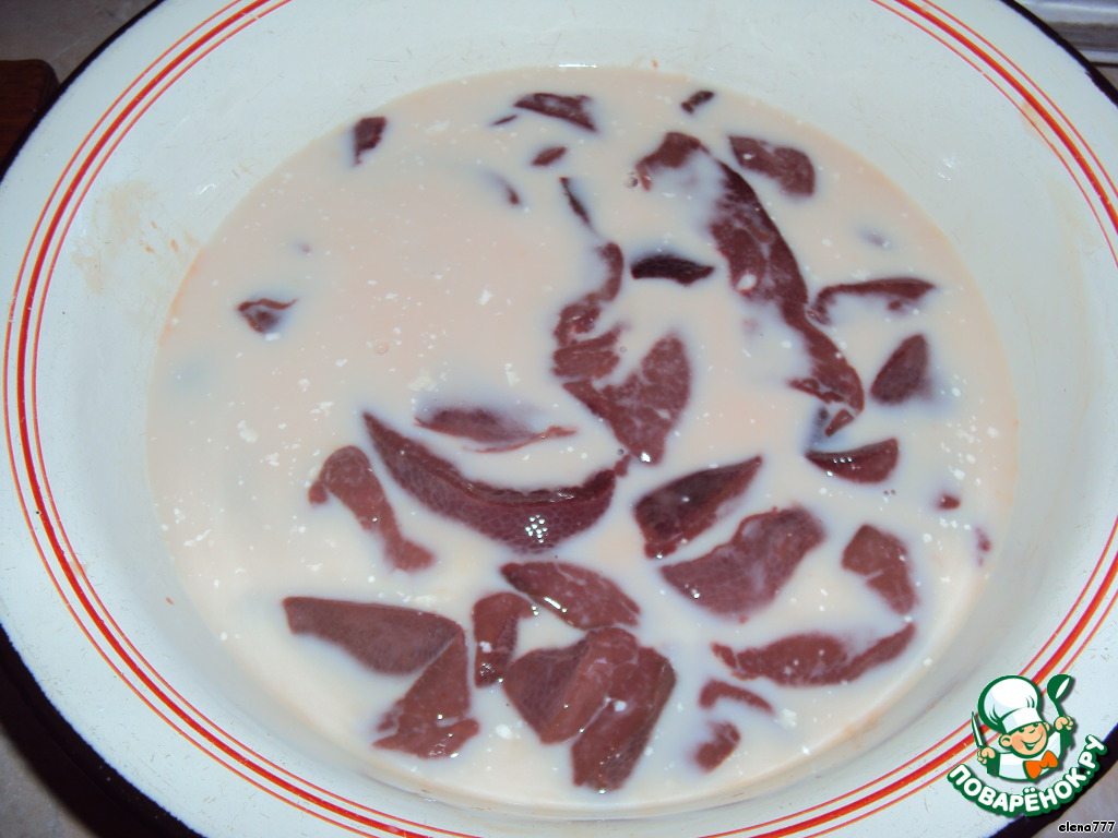 В холодном молоке развести соду и залить ломтики печени. Оставить на 30 минут.