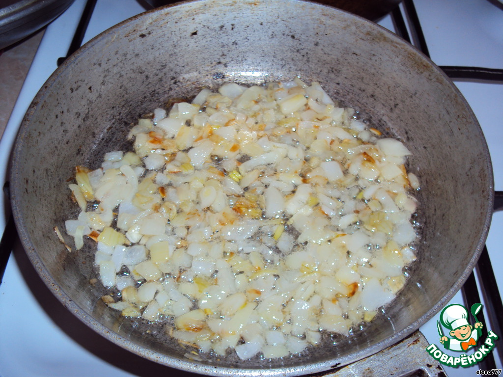 Пока отмачивается печень, нарезать лук и слегка обжарить его на растительном масле.