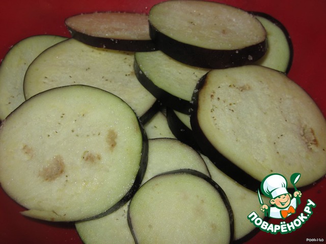 Баклажан помыть , отрезать кончики , нарезать кружками(не более 1 см толщиной), посолить , положить под гнёт.
