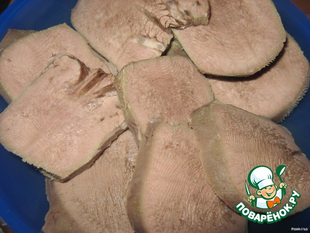 Отварной язык нарезать ломтиками.