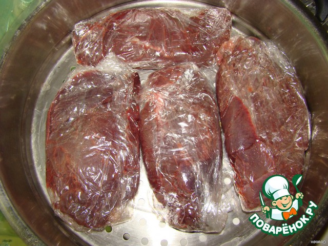 Посолим.Перчим,Заворачиваем в пищевую пленку и выкладываем на решетку пароварки.Варим на пару 10-15 минут Зависит от толщины кусков