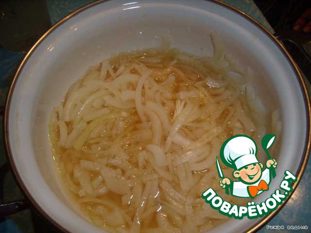 Лук режем полукольцами. Ошпариваем кипятком, даем остыть.
