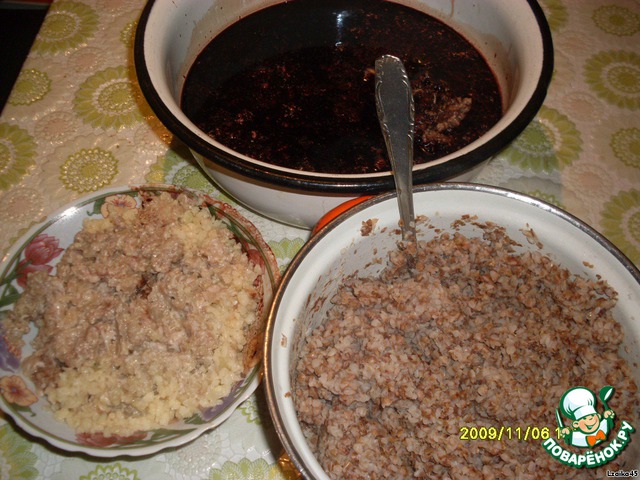 В кровь добавляем перекрученное с луком и чесноком сало, гречку и молоко. Солим, перчим. Очень важно не пересолить, т.к. кровь соленая сама по себе. Вымешиваем.