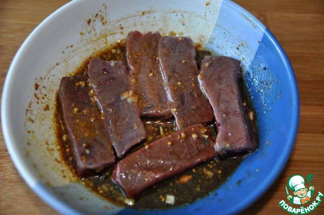 Порезанную печень кладём в маринад, перемешиваем, оставляем мариноваться 30 минут.