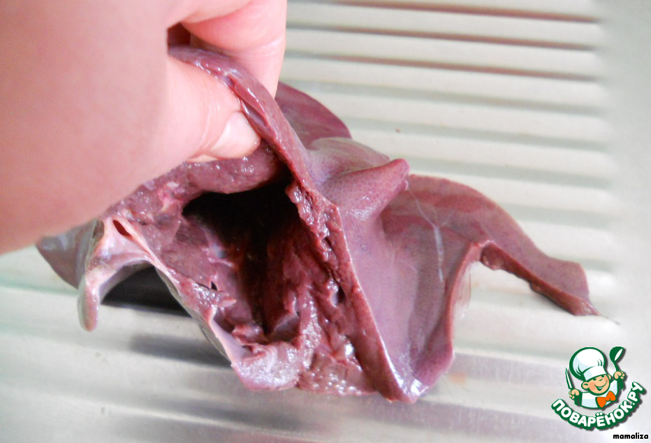 Печень глубоко надрезать вдоль края, чтобы получился кармашек.