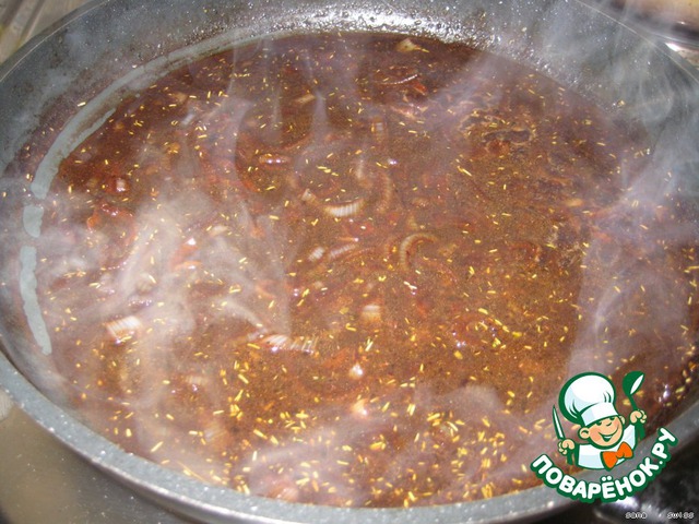 Уменьшить огонь и на сковороде обжарить лук, добавить специи, бульон, коньяк и тушить, пока жидкости останется совсем мало.