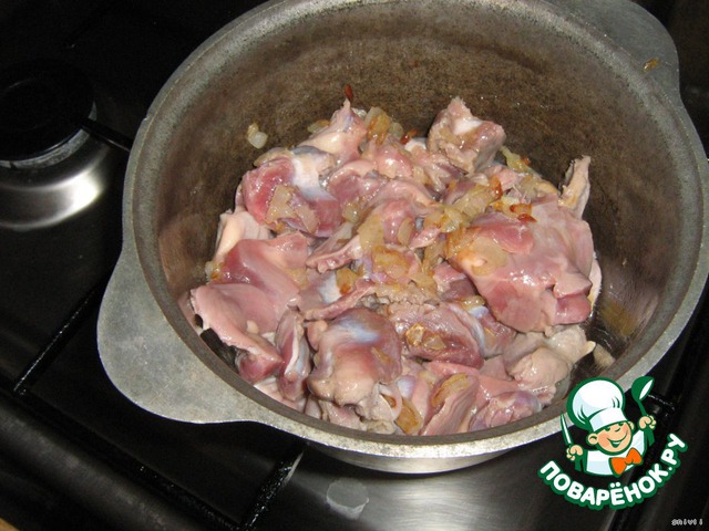 Когда пупочки пустят сок. Добавить пол чайной ложечки пищевой соды. На фото не видно, но соус вспенится и лук растворится. Это самая главная тонкость в приготовлении тушеного мяса.(Кстати, мясо так тоже он готовит)