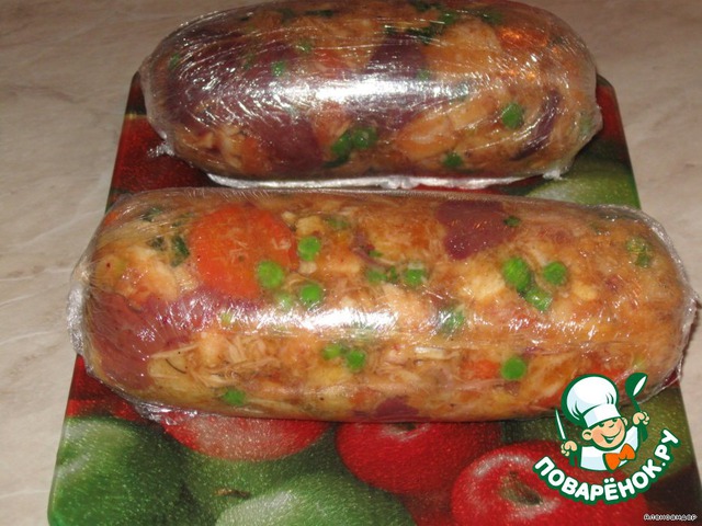 Все ингредиенты порезать и смешать. Добавить специи, кетчуп, яйца и желатин. Завернуть в несколько слоев пищевой пленки, как конфету и положить в форму с водой. Вода доходила где-то до половины батона. Накрыть фольгой и выпекать в духовке минут 40 Это очень вкусно.