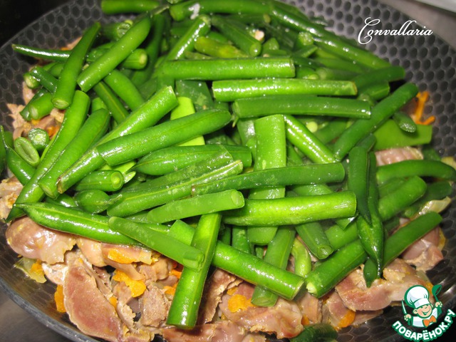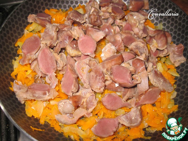 К овощам добавить куриные желудки, нарезанные на небольшие кусочки.