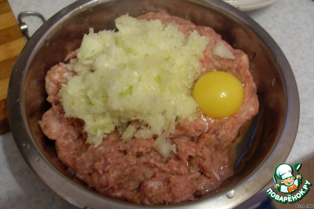Лук измельчить. Я измельчала в блендере, чтобы фарш был однородным. Добавить в фарш лук и 1 яйцо, соль, перец.