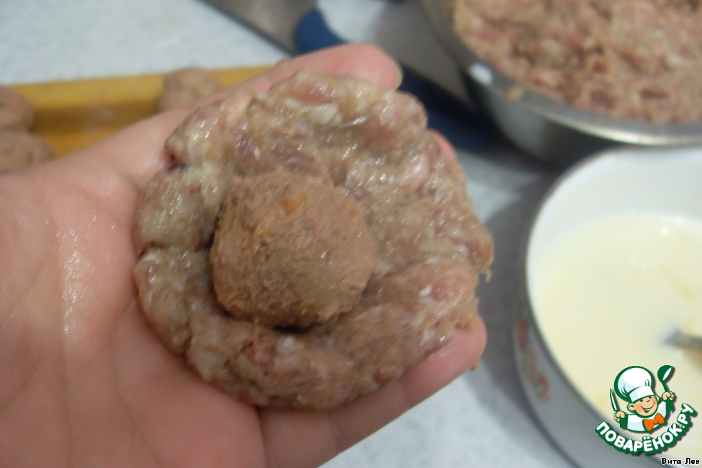 Из мясного фарша делаем лепешку, всередину кладем печеночный шарик