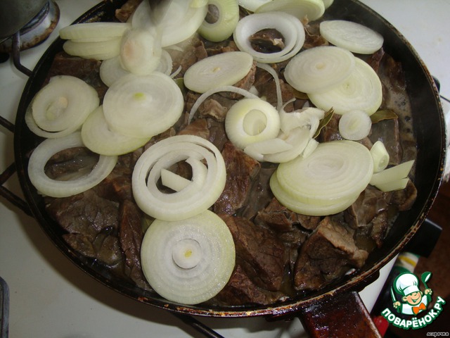 Ставим тушить в сковороде. Добавляем 1 стакан воды, смалец, лавровый лист, перец горошком, солим. Протушить 20 мин.