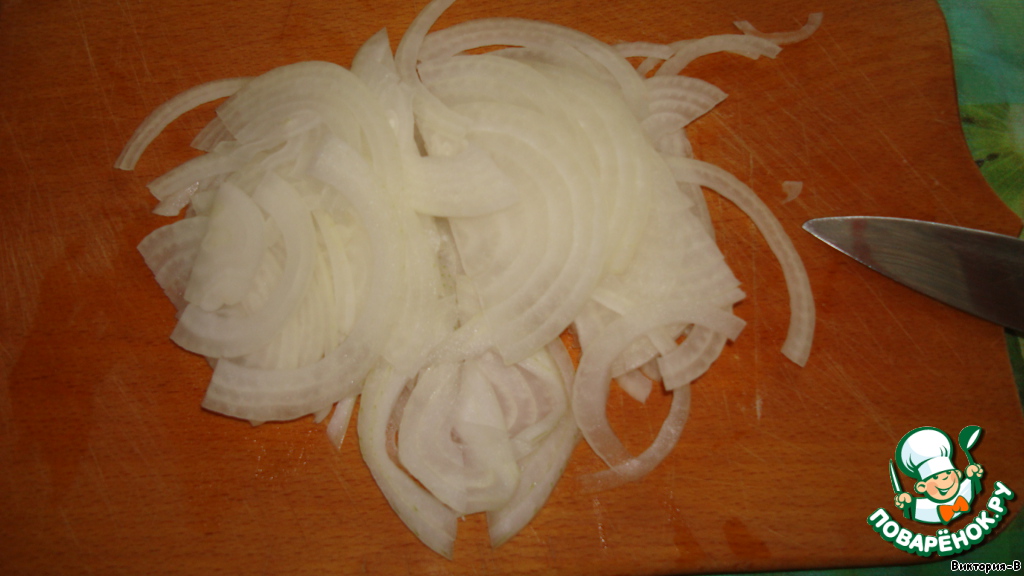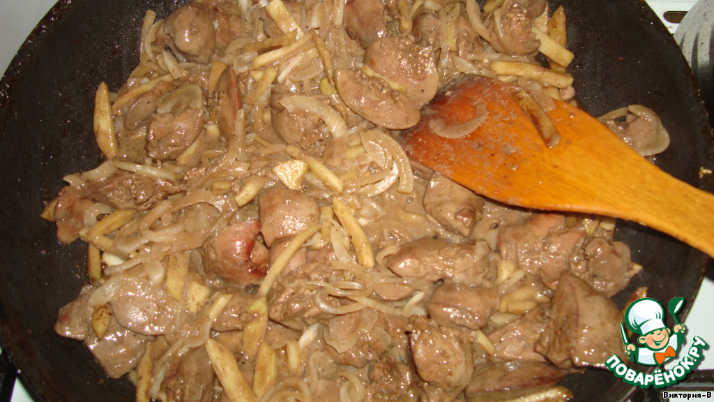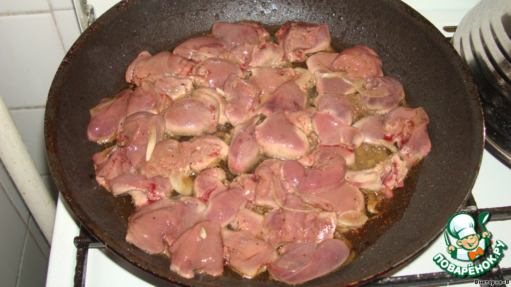 Печень обсушить, удалить плёнки, нарезать кусочками, добавить к луку
