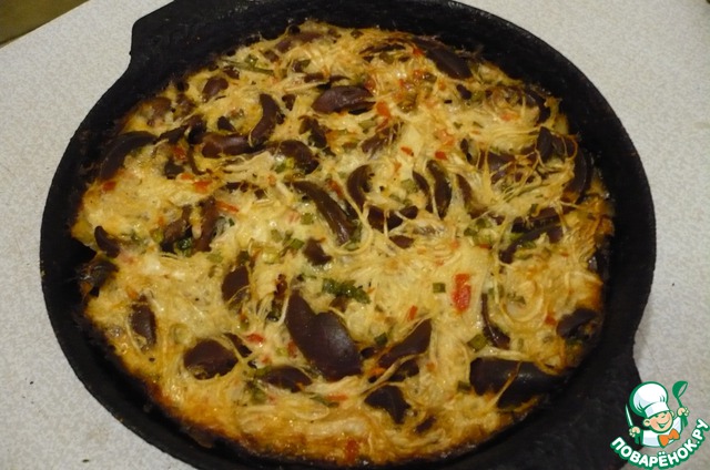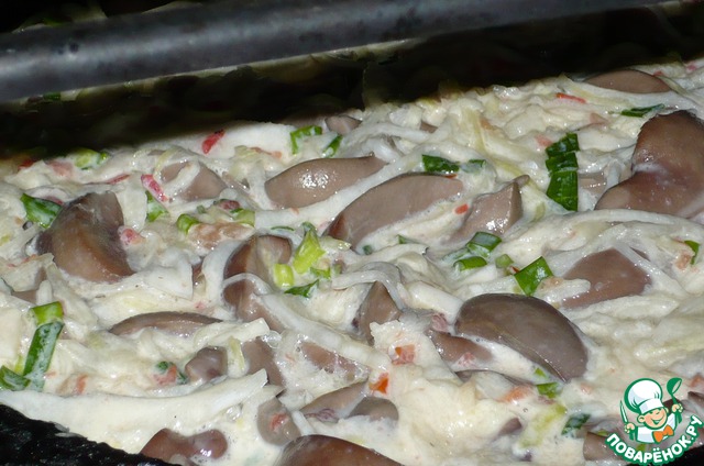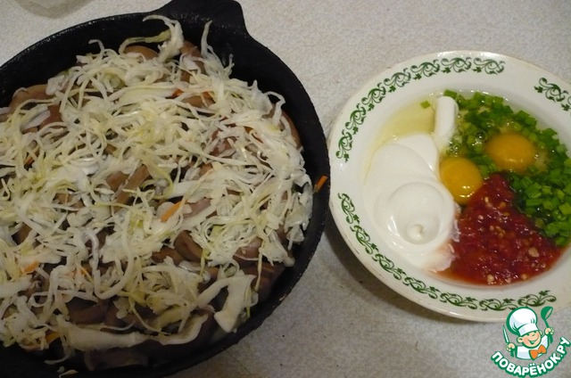 Поверх почек кладем капусту. Смешиваем йогурт, яйцо, резанный лук и хренодер. Этим соусом заливаем сверху.
