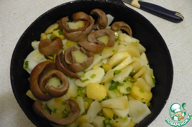 Сковороду смазать маслом. Налить немного воды. На дно порезать отварной картофель. Сверху положить почки и резанный лук.