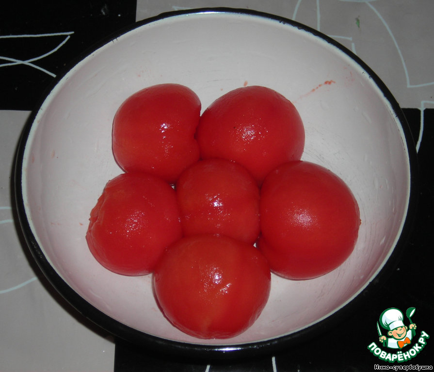 Помидоры вымыть, надрезать, залить кипятком на 1 минуту, охладить под струей холодной воды и снять кожицу.