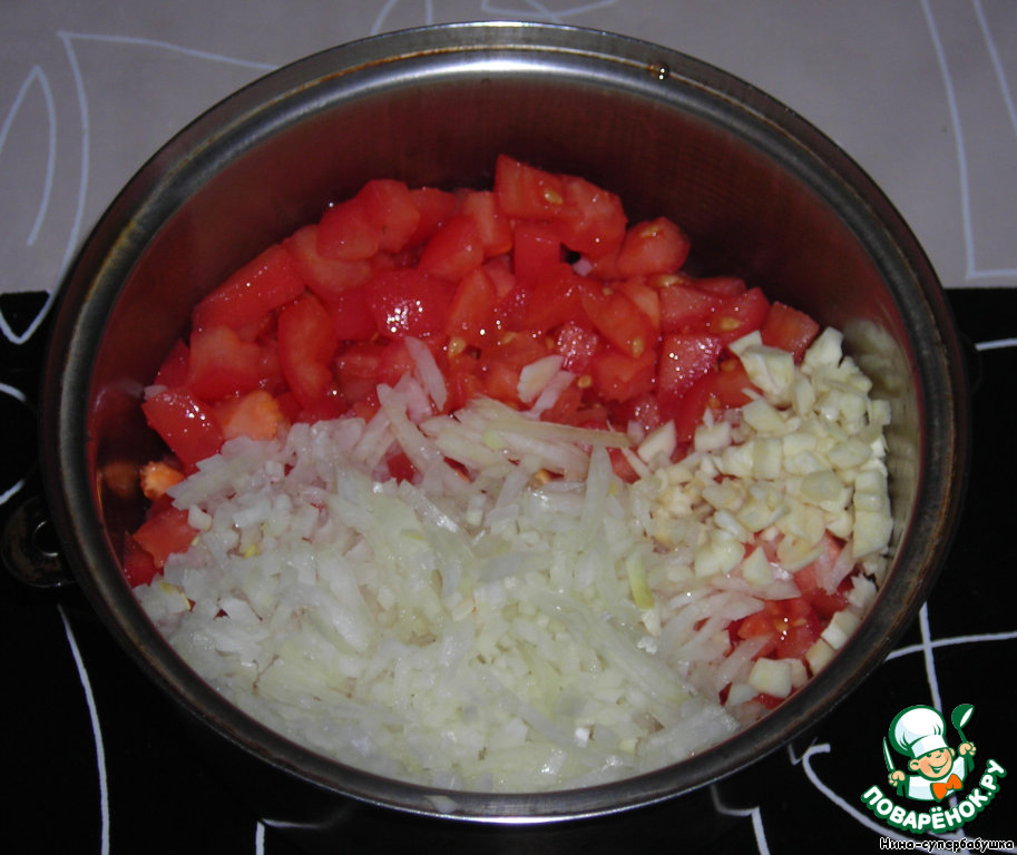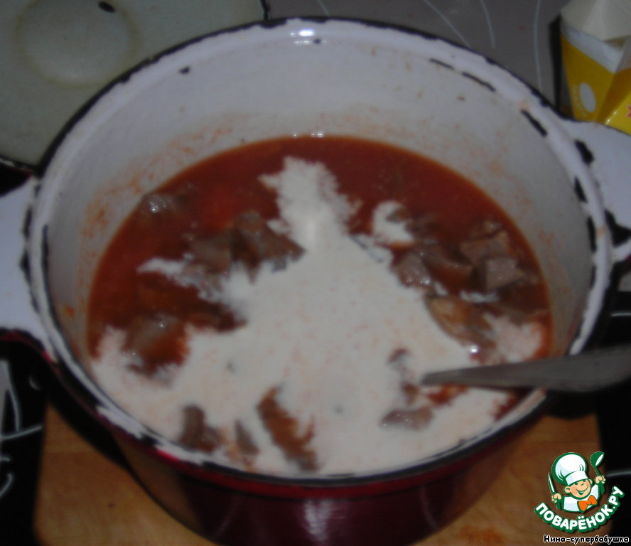 Положить нарезанное мясо в кастрюлю, сверху протереть через сито помидорную массу.