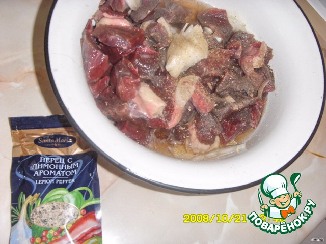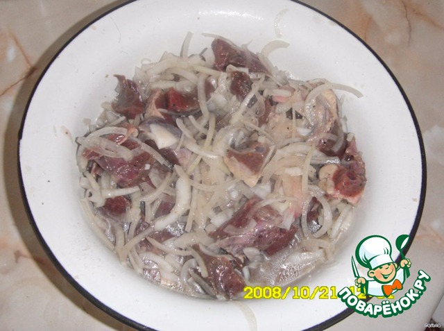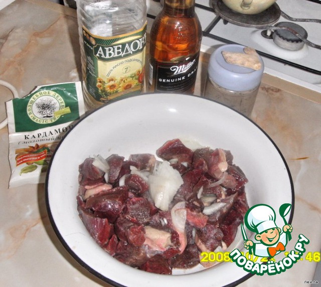 Обработать, очистить, помыть говяжье сердце. Нарезать, положить в чашку, туда же - нарезаный лук, пиво, масло, кардамон, имбирь,