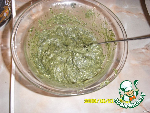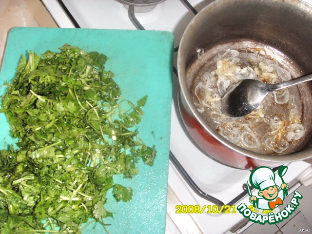 CОУС: лук порезать полукольцами, чуть обжарить в растительном масле и добавить нарезанную зелень. Тушим под крышкой. Можно добавить 1 зуб. чеснока.