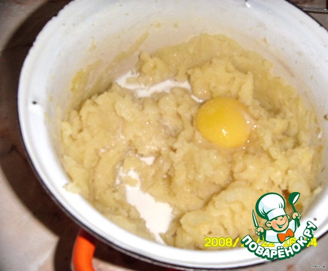 Картофель отвариваем в подсоленной воде, мнем ступкой, кладём желток, молоко, сливочное масло и взбиваем миксером.