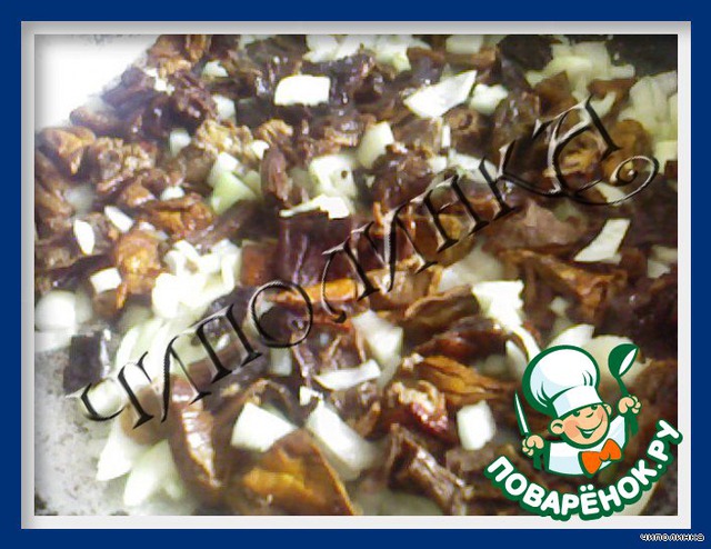 Замоченные грибы отварить, слить отвар в отдельную посуду ([b]Не выливать![/b]). Нарезать грибы небольшими ломтиками.