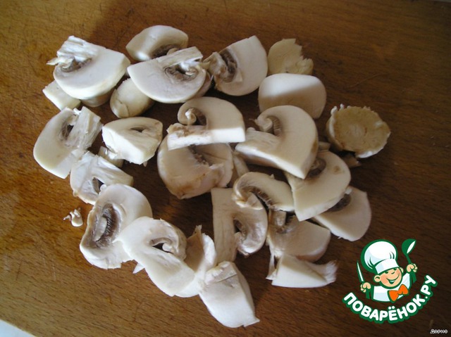 Займёмся грибами. Помыли, нарезали, и - к честной компании. Грибы тоже соку немного пустят.