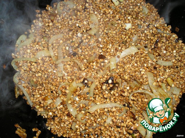 Промываем чашечку гречки (у меня - 200-граммовая) и отправляем к луку. Минутки две обжариваем.