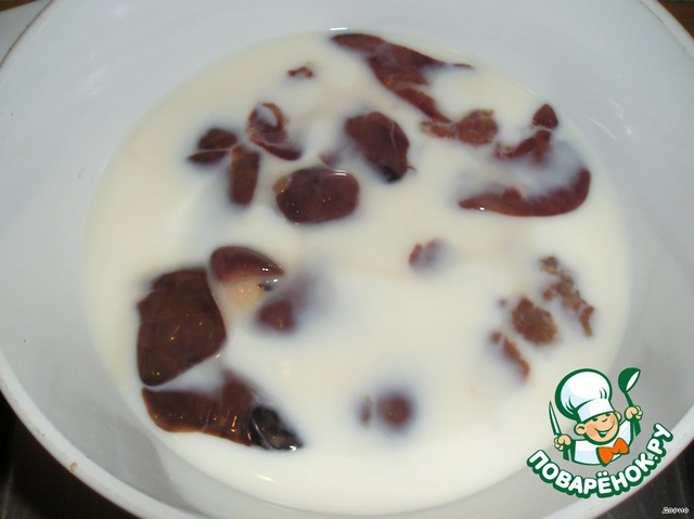 Кладем печень в молоко и томим на медленном огне