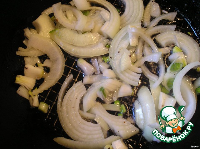 А пока режем лук полукольцами и обжариваем.