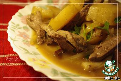 Печень с ананасами и луком, тушеная в ананасовом сиропе