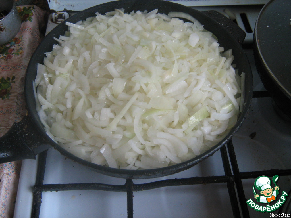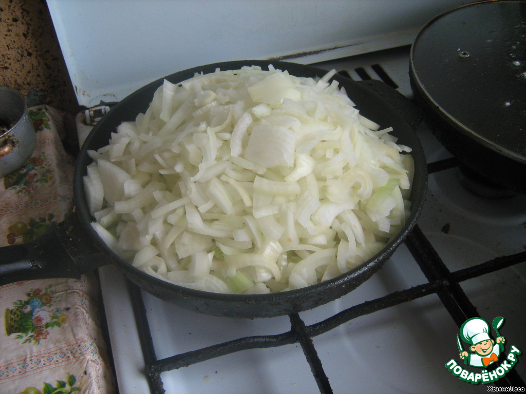 Сразу закидываем лук в хорошо разогретую сковородку с растительным маслом. Если получилось горкой - не страшно, накрываем крышкой и ждем, он усядется.