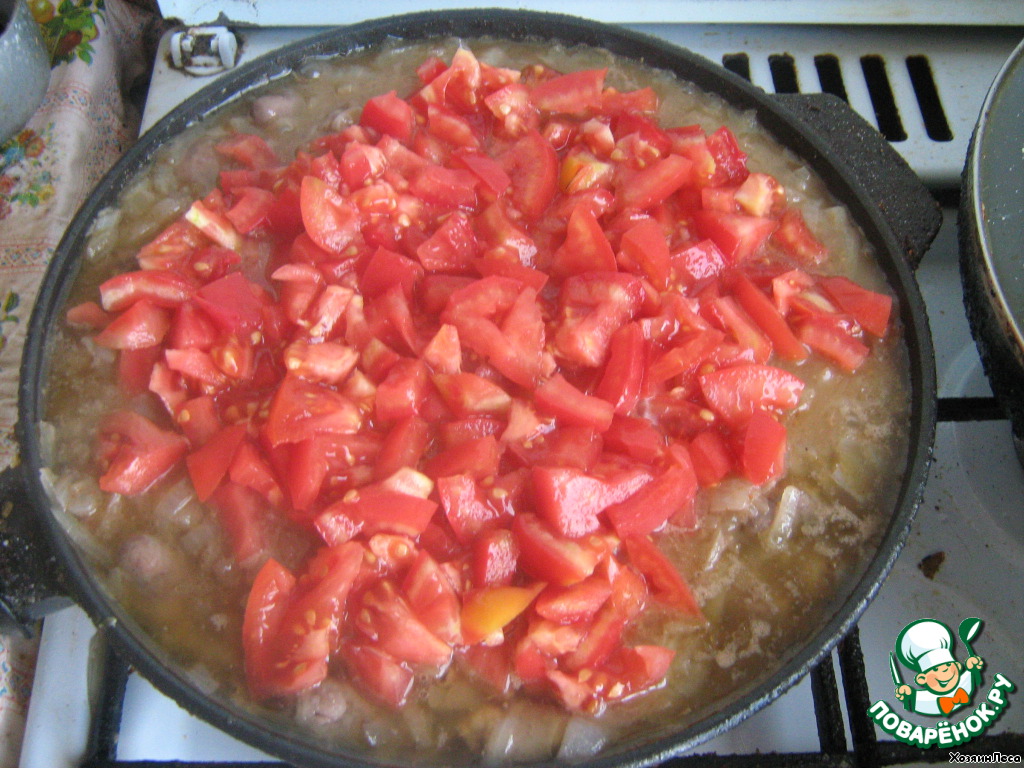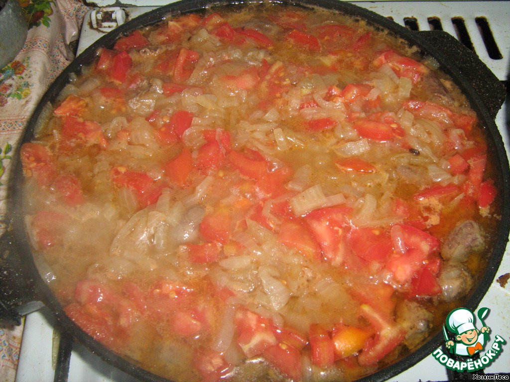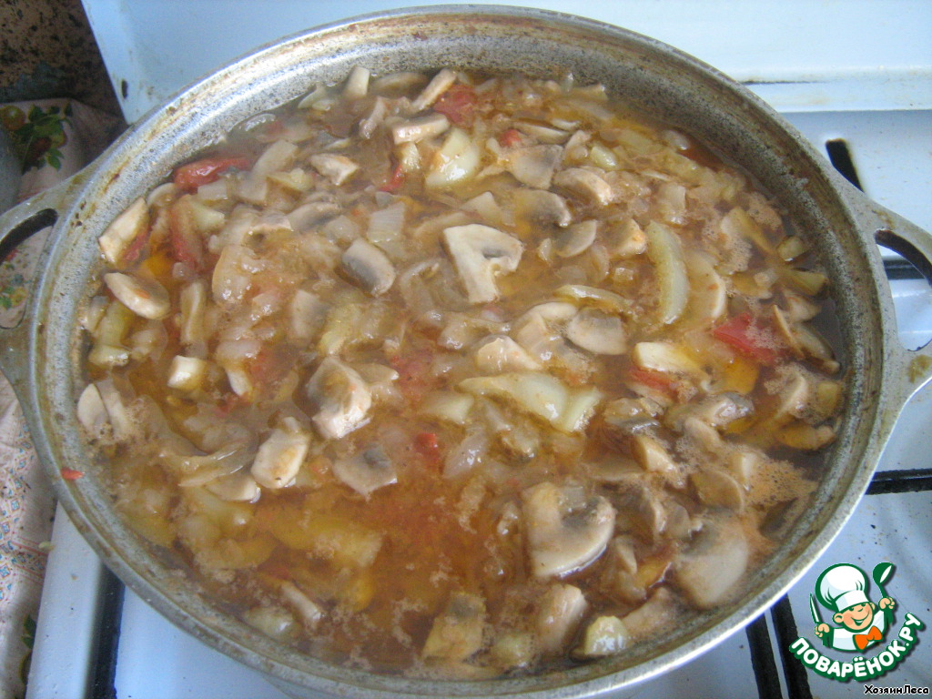 К сердечкам добавляем перец и грибы. на данном этапе мне пришлось пересыпать все в казанок, так как сковородка оказалась маленькой, так что стоит рассчитывать размер посуды. Все это перемешиваем и тушим под крышкой на среднем огне минут 15, потом выключаем и ждем еще минут 5-10.