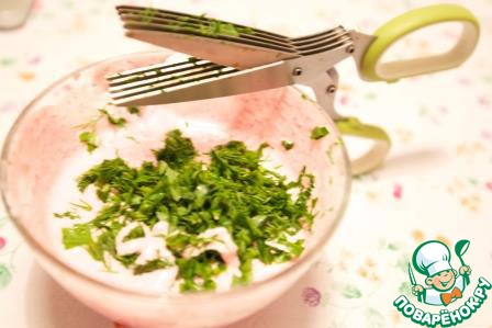 Приготовим соус: смешать сметану с хреном и зеленью. Посолить, поперчить.