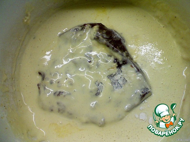 Смешать 2 яйца, 6 ст.л. сметаны и муку, чтобы получилось по консистенции, как густая сметана. Добавить соль и приправы по вкусу (я добавляла свою любимую "Вегету").