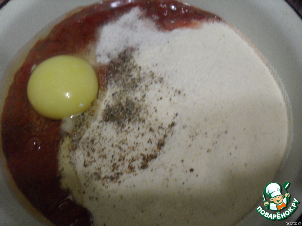 Добавить манную крупу, сметану, яйцо, соль и черный перец.