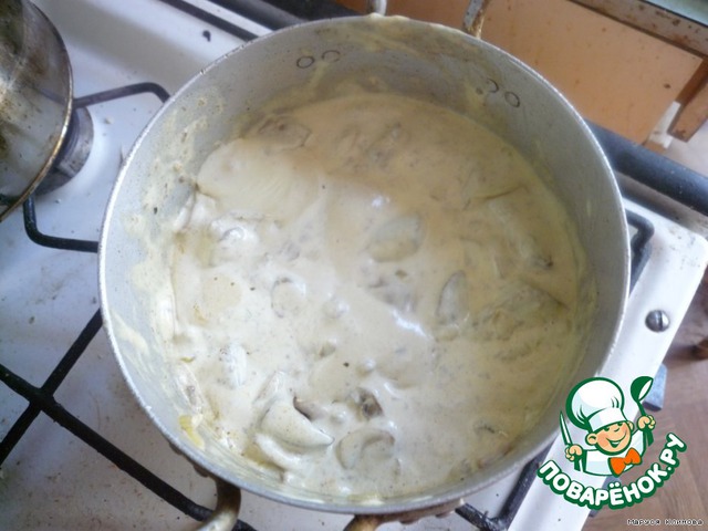 Жареные грибы с луком и обжаренную печенку отправить в кастрюльку. Залить данную смесь подобием соуса из сметаны и майонеза.