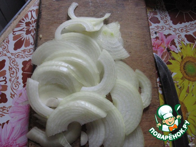 Режем тонкими полукольцами лучок.
