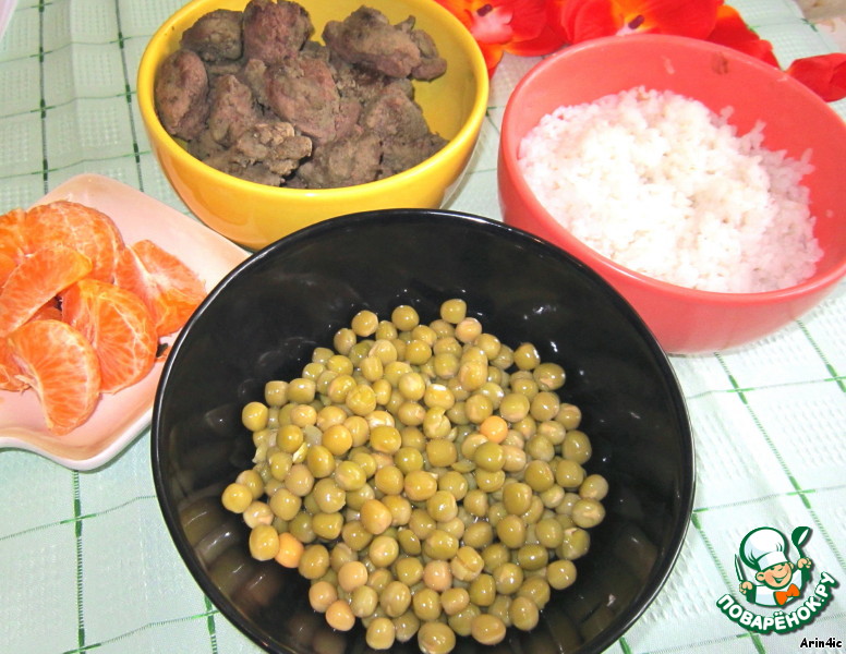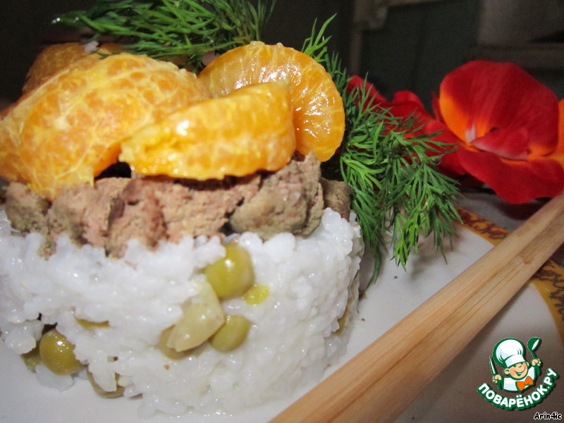 Подавать, выкладывая на тарелку слоями: рис, печень, мандарины.