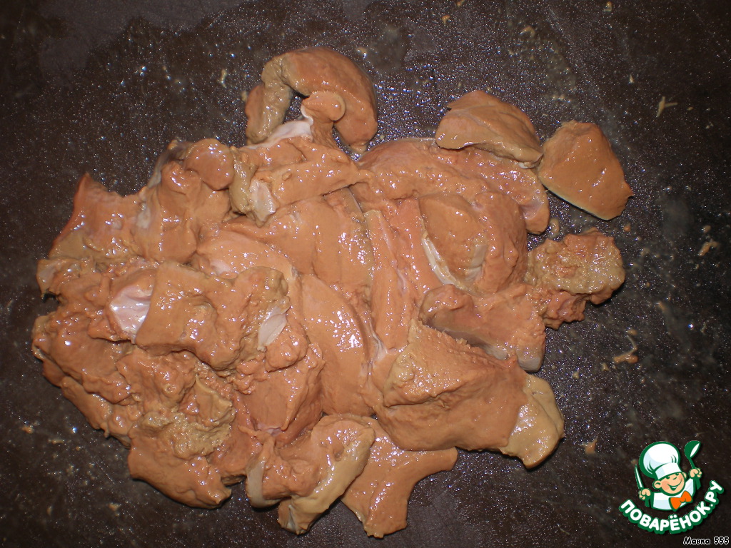 Режем печень на средние кусочки, не забываем удалять пленочку на ней.