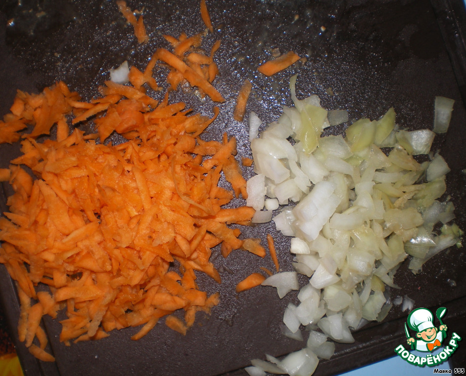 Затем, трем крупно морковь и режем лук.
