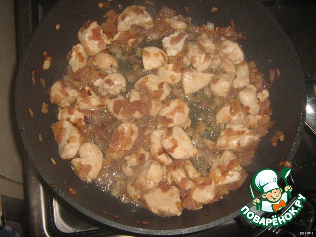 Добавить к луку кусочки грудки. Обжаривать 10 мин до золотистого цвета.
