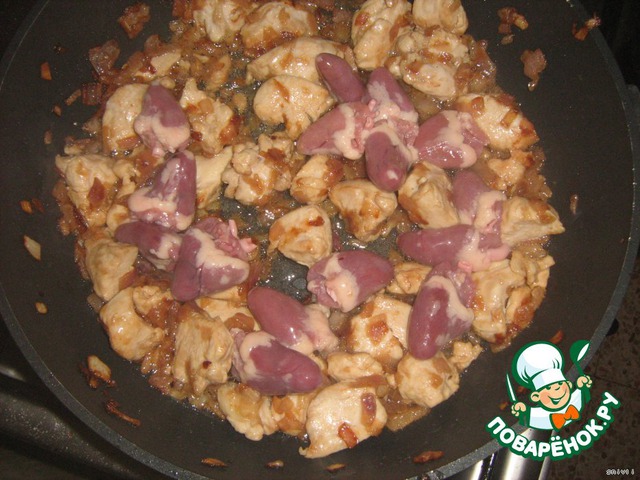 Последними добавляем куриные печень и селезенку. Их обжариваем 3-5 минут, поскольку они готовятся очень быстро.